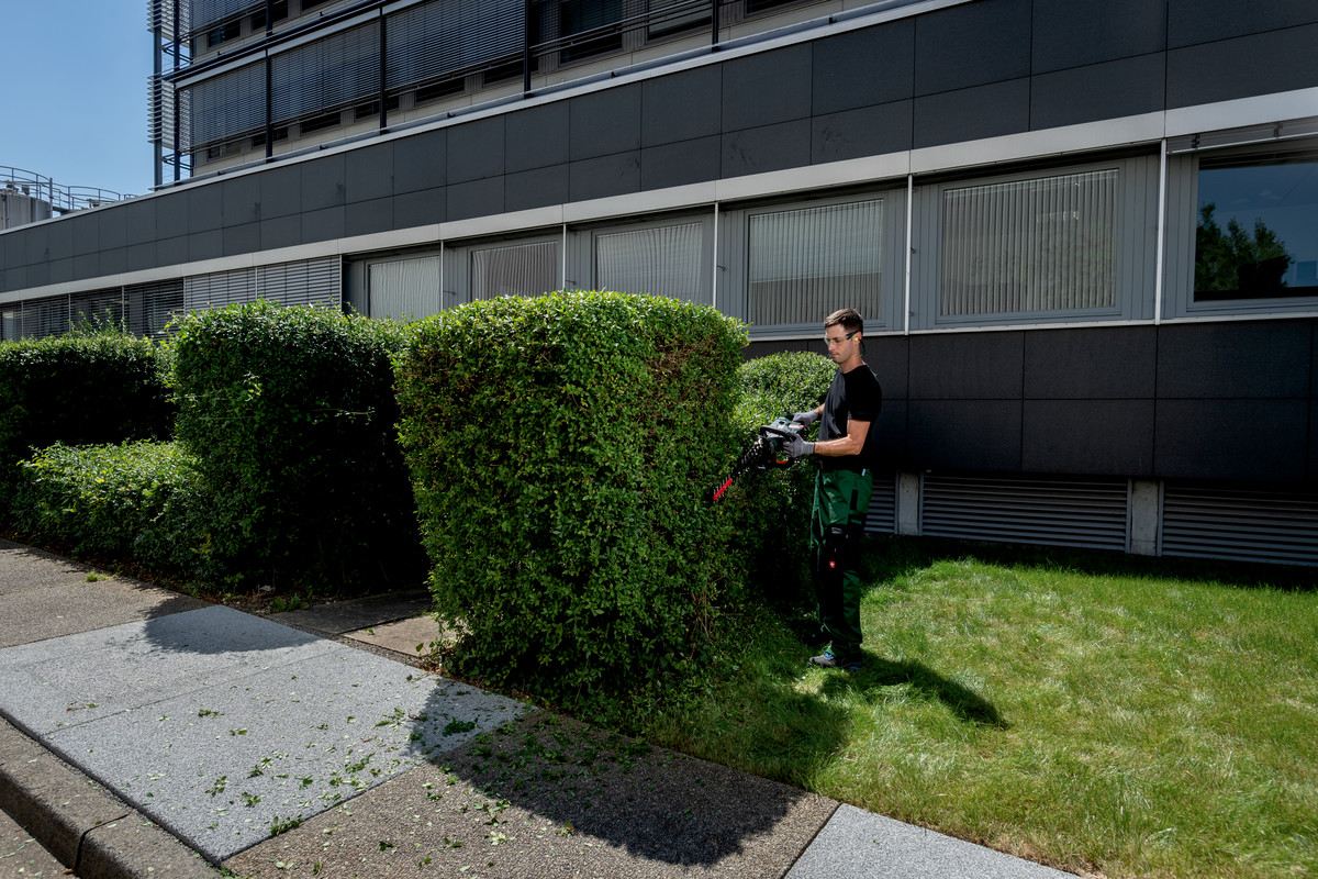 - Kraftvolle, bürstenlose Akku-Heckenschere mit drehbarem Griff für komfortablen Trimm- und Rückschnitt
