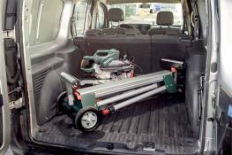 • Leichtes und robustes Kappsägen-Untergestell mit Trolleyfunktion für den mobilen Einsatz auch mit montierter Säge
