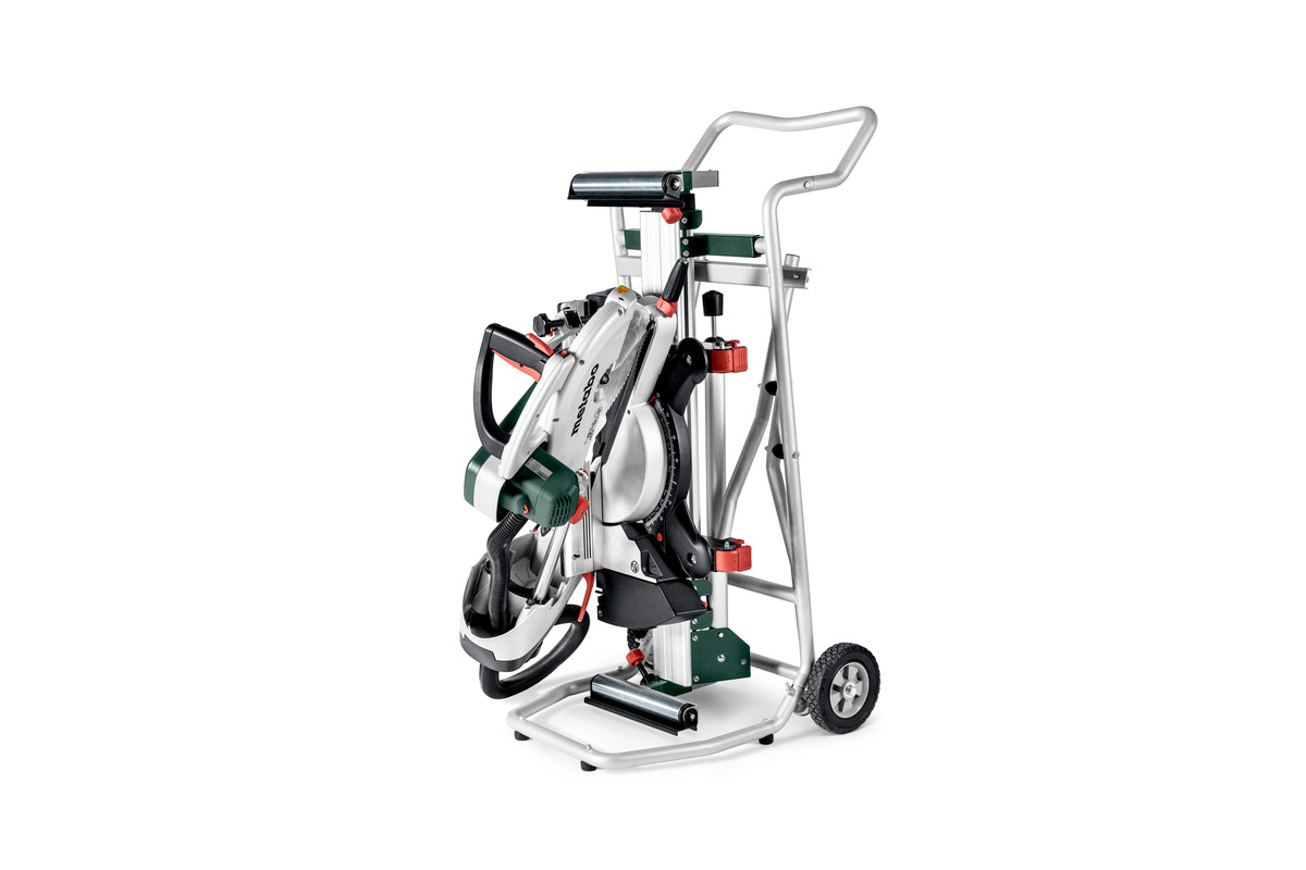 • Besonders robustes Kappsägen-Untergestell mit Trolleyfunktion für den mobilen Einsatz auch mit montierter Säge