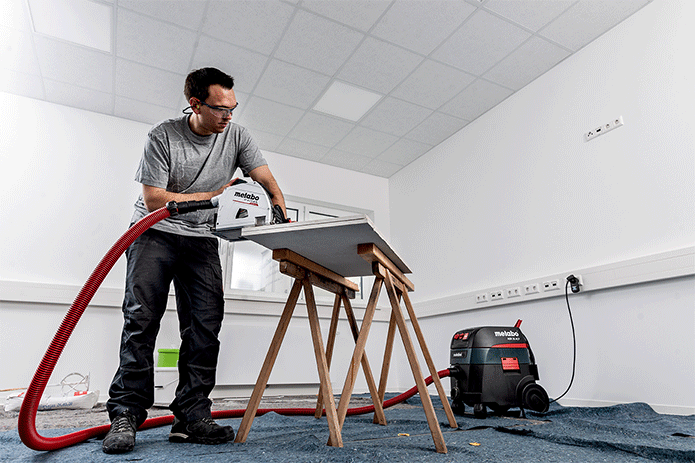 Um den Sauger für die berührungslose Bedienung startklar zu machen, gibt es das neue CordlessControl-System von Metabo im Set. Es besteht aus drei Elementen: Einem Sender, einer Empfänger-Steckdose und einem Multiband, das auf alle gängigen Saugschläuche passt. Damit kann der Profi in drei einfachen Schritten jeden Netzsauger mit seinem Akku-Werkzeug verbinden: Zunächst wird das Netzkabel des Saugers in die Empfänger-Steckdose eingesteckt. Dann befestigt der Profi den Sender mit dem Multiband am Saugschlauch. Im Sender ist ein Vibrationssensor eingebaut, der die Vibration der Maschine erkennt und das Signal über die Empfänger-Steckdose an den Sauger weitergibt. Im letzten Schritt startet der Profi seine Akku-Maschine und schon startet und stoppt der Sauger analog zum Werkzeug. „Nutzt der Profi beispielsweise eine Akku-Tischkreissäge von Metabo und einen Netzsauger eines anderen Herstellers, kann er mit CordlessControl die beiden Geräte einfach und schnell verbinden. Sobald er anfängt zu sägen, startet der Sauger parallel“, erklärt Koch. Aber auch der manuelle, funkgesteuerte Start und Stopp des Saugers ist möglich – dazu muss der Profi nur den Remote-Control-Knopf drücken. Der Knopf ist direkt vorne am Saugschlauch befestigt und damit stets in Reichweite – das bedeutet zusätzlichen Komfort und spart Zeit.